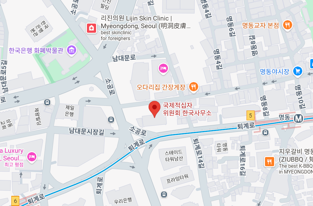 찾아오는 길 국제적십자위원회 (ICRC) 한국사무소 전화 +82 02-779-5377 이메일 seo_seoul@icrc.org 주소 서울특별시 중구 퇴계로 97, 고려 대연각타워 5F, 우편 04535